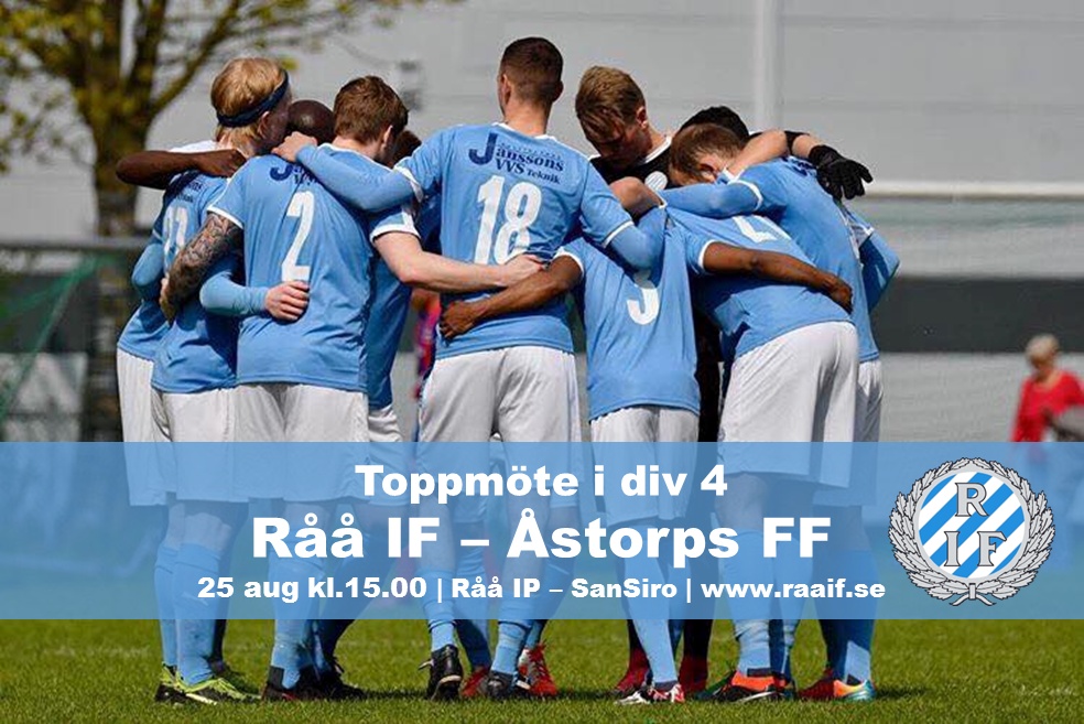 På lördag kl. 15.00 är det dags för toppmatch när Råå IF:s herrar tar emot Åstorp på SanSiro i en viktig match för slutstriden. Råå IF ligger just nu på en tredjeplats i tabellen bara 3 poäng efter serieledande Fortuna. Vi hoppas på mycket folk på SanSiro som kan stötta de ljusblåa. Stickans kiosk kommer att vara öppen och grillen kommer att vara tänd. Varmt välkomna!