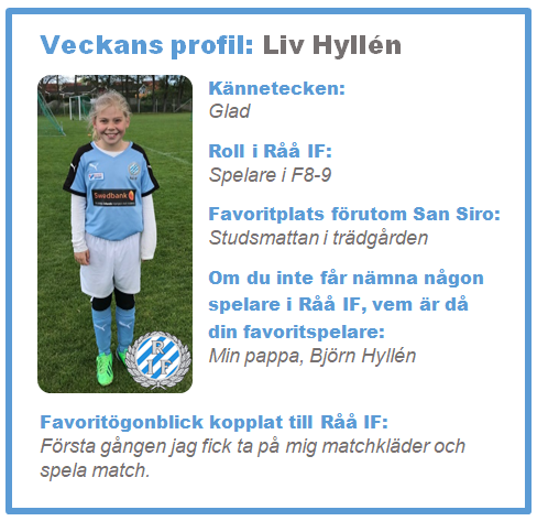 Äntligen fredag och dags för Veckans profil. Vi är mitt uppe i vårens stora cuphelg för barn och ungdomar och det är självklart på sin plats att ni får träffa en av våra duktiga unga spelare. Det här är Liv Hyllén som spelar i vårt F8-9 lag. Vi önskar både Liv och er övriga en härlig cuphelg!