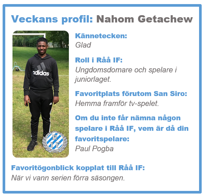 Fredag igen och veckans profil är den här gången vår duktiga Nahom som inte bara är spelare i juniorlaget utan även en av våra ungdomsdomare. Vi önskar både Nahom och er en riktigt fin fredag och en härlig fotbollshelg!