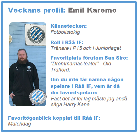 Redan fredag och det är dags för vår duktiga ungdomstränare Emil att vara veckans profil. Vi önskar Emil och alla er andra en riktigt fin fotbollshelg!