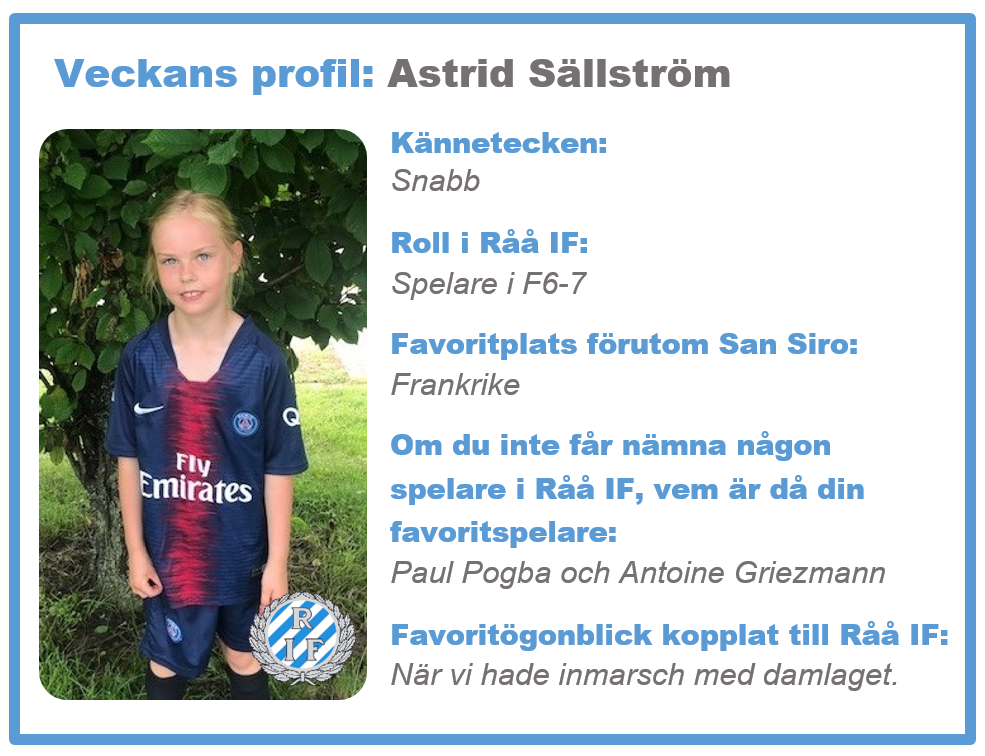 Fredag igen! Det är dags för veckans profil och denna gång är det en snabb och teknisk tjej i vårt yngsta tjejlag vi presenterar, nämligen Astrid Sällström. Vi önskar både Astrid och alla er andra en fin sommarhelg!