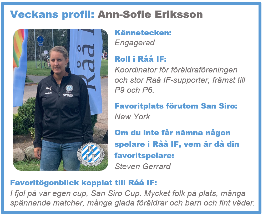 Det är fredag och det är fortfarande sommar samtidigt som höstsäsongen börjar dra igång för många lag. Detta firar vi genom att presentera en fantastiskt duktig kvinna som samordnar våra viktiga föräldrar. Utan föräldrarnas hjälp kan inte en ideell förening som Råå IF fungera så bra som den gör. Kvinnan som koordinerar vår fina föräldraförening är Ann-Sofie Eriksson som är denna veckas profil. Vi önskar Ann-Sofie och alla er andra en riktigt fin helg!