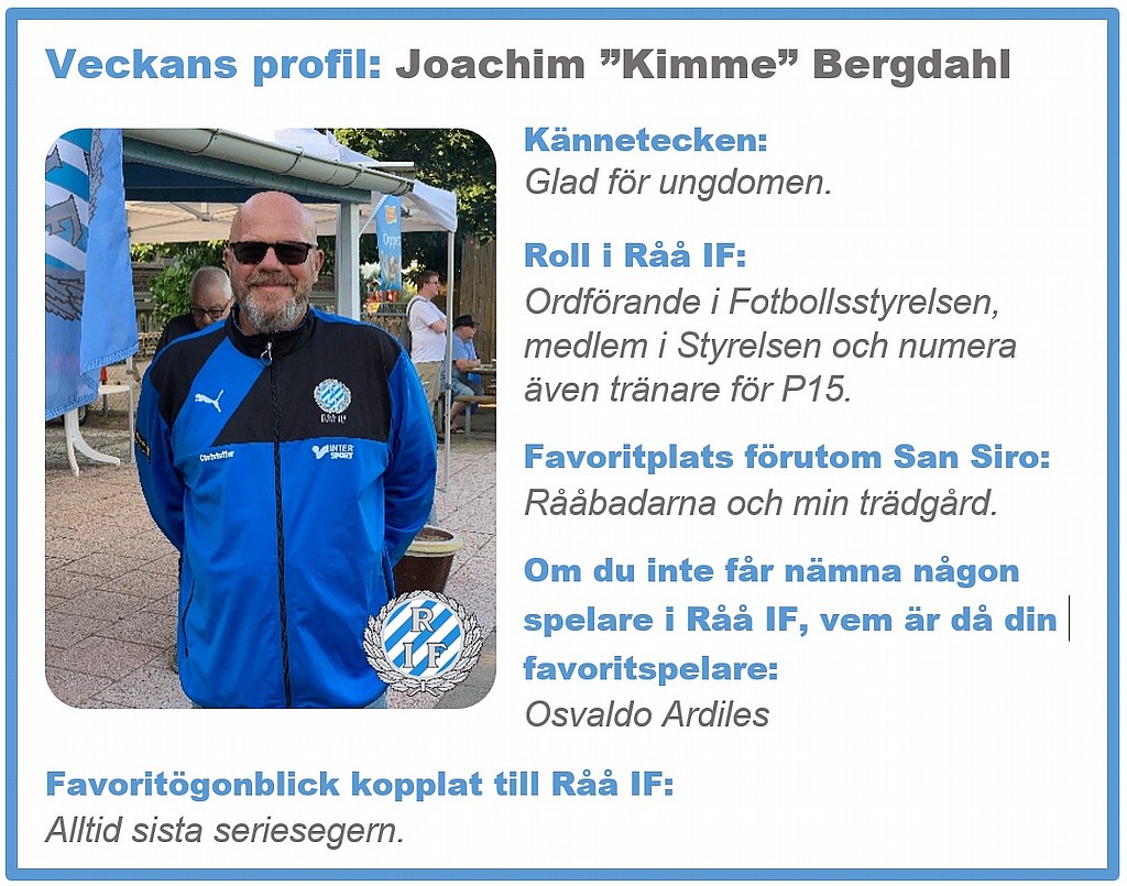 Fredag, fredag, fredag, veckans bästa dag! Veckans profil är denna gång ingen mindre än Joachim "Kimme" Bergdahl. En fantastisk man som sitter på många Råå IF-stolar och gör det med den äran! Vi önskar Kimme och alla er andra en underbar helg i värmen! #forzarååif #ännuettstabiltspursfan