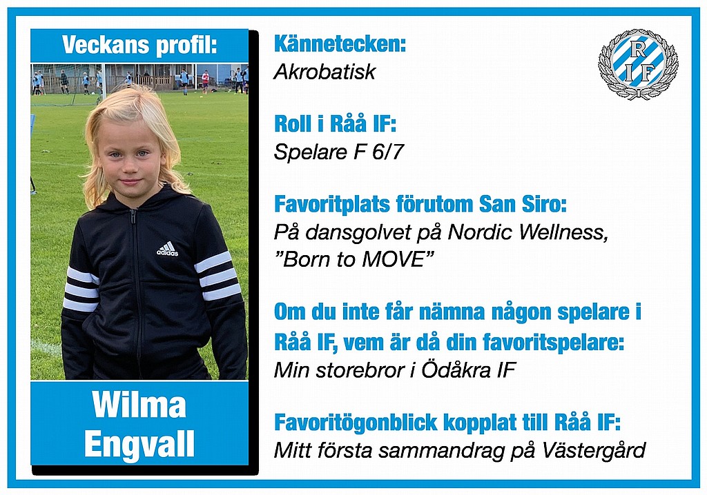 Fredag, fredag, fredag. Det firar vi som vanligt med att presentera veckans profil som denna gång är 6-åriga Wilma Engvall. Wilma är en akrobatisk och snabb tjej som spelar i vårt yngsta tjejlag F6-7. Vi önskar Wilma och alla er andra en riktigt fin fotbollshelg!
