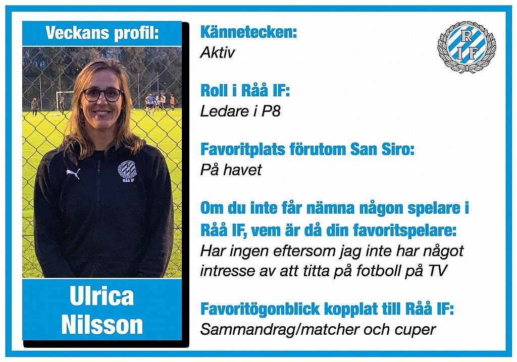 Höstsäsongen börjar nu sakta närma sig sitt slut men än återstår det några härliga seriematcher för våra barn och ungdomar (och även för damlaget som spelar hemma på lördag). Det är äntligen fredag och det innebär så klart att det är dags för Veckans profil. Turen har denna gång kommit till Ulrica Nilsson, tränare för vårt duktiga P8-lag. Vi önskar Ulrica och alla er andra en riktigt fin helg!