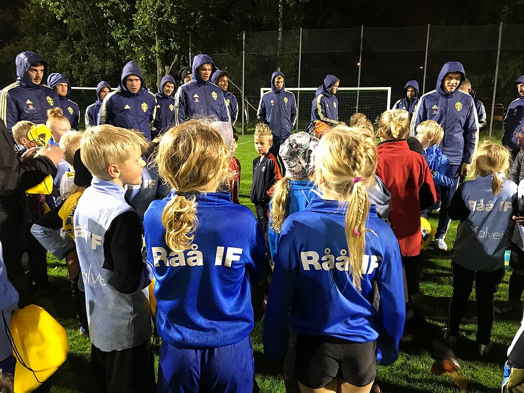 Vilken fantastisk kväll på Råå IP! Vårt P8 och F8-9 fick ikväll hjälp med träningen av inga mindre än svenska U21-landslaget som kom och besökte SanSiro. U21-laget håller som bäst på att ladda inför EM-kvalmatchen mot Island på lördag på Olympia men tog sig ändå tiden att komma och vara med på träningen. Många lyckliga små lirare, tränare och föräldrar uppskattade besöket. Även U21-spelarna såg ut att njuta av kvällen och bjöd på sig själva. Nu hoppas vi att killarna tar hem segern på lördag. Stort tack för att ni kom och förgyllde vår kväll!
