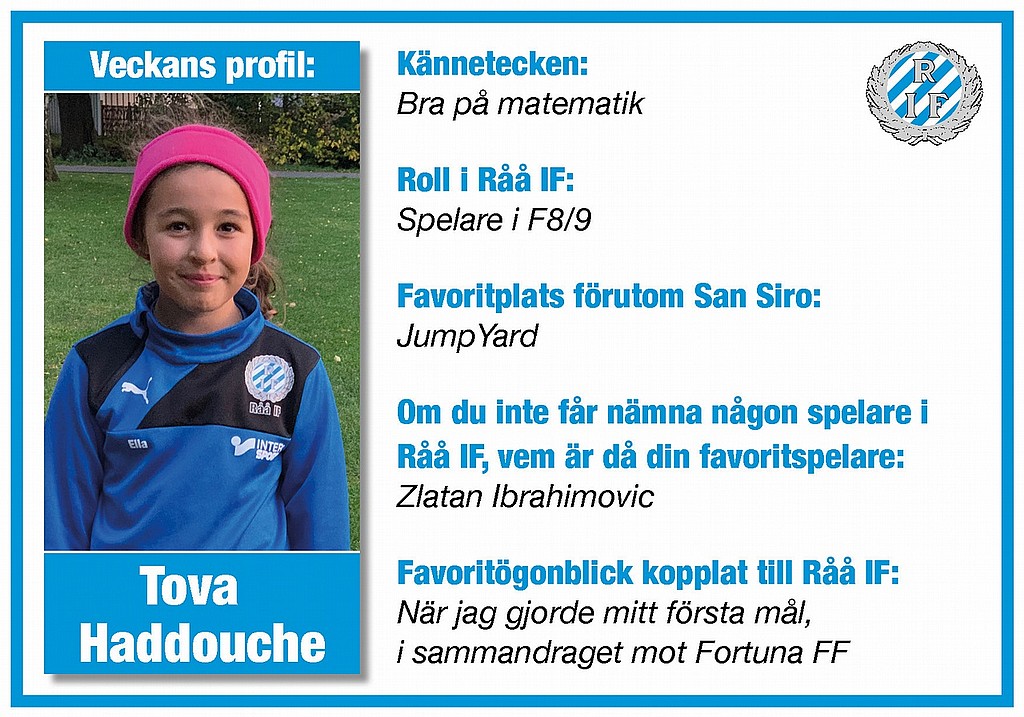 Fredag igen! Höstrusket har gjort sig påmint men då värmer det med besök av U21-landslaget på Råå IP, det värmer med knatteavslutning och seriespel och framför allt värmer det att läsa om Veckans profil som denna gång är den charmiga och duktiga Tova Haddouche. Tova spelar i vårt F8-9 lag. Vi önskar Tova och alla er andra en riktigt fin helg! #forzarååif #hejasweu21