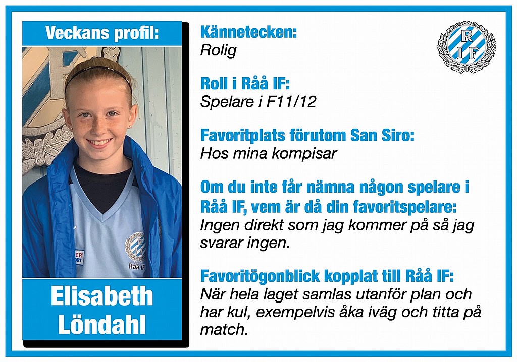 Det är fredag, det är vackert väder och vi är redo för att presentera Veckans profil som denna gång är talangfulla och glada Elisabeth Löndahl som till vardags spelar i F11-12 år. Vi önskar Elisabeth och alla er andra en riktigt fin Allhelgonahelg!