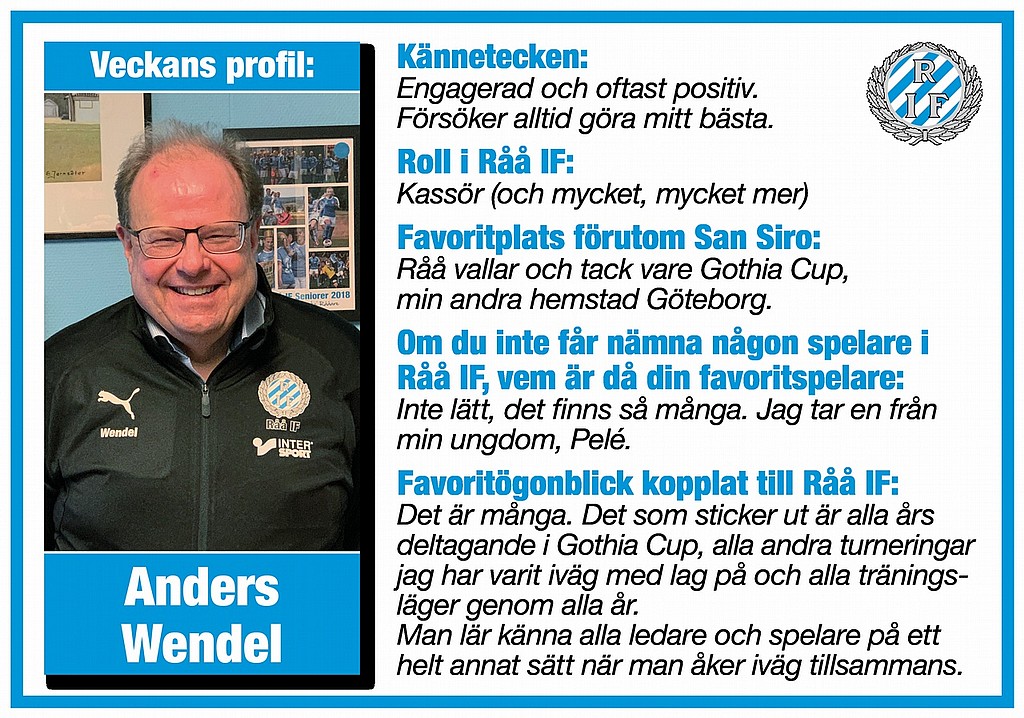Fredag igen och det är dags för en riktig Råå IF-legend att vara Veckans profil! Denna vecka är det: kassören/inköparen/administratören/styrelseledamoten/speakern/damcupschefen och trotjänaren nummer 1, Anders Wendel, som är vår profil. Vi önskar dig Anders och alla er andra en underbar helg!