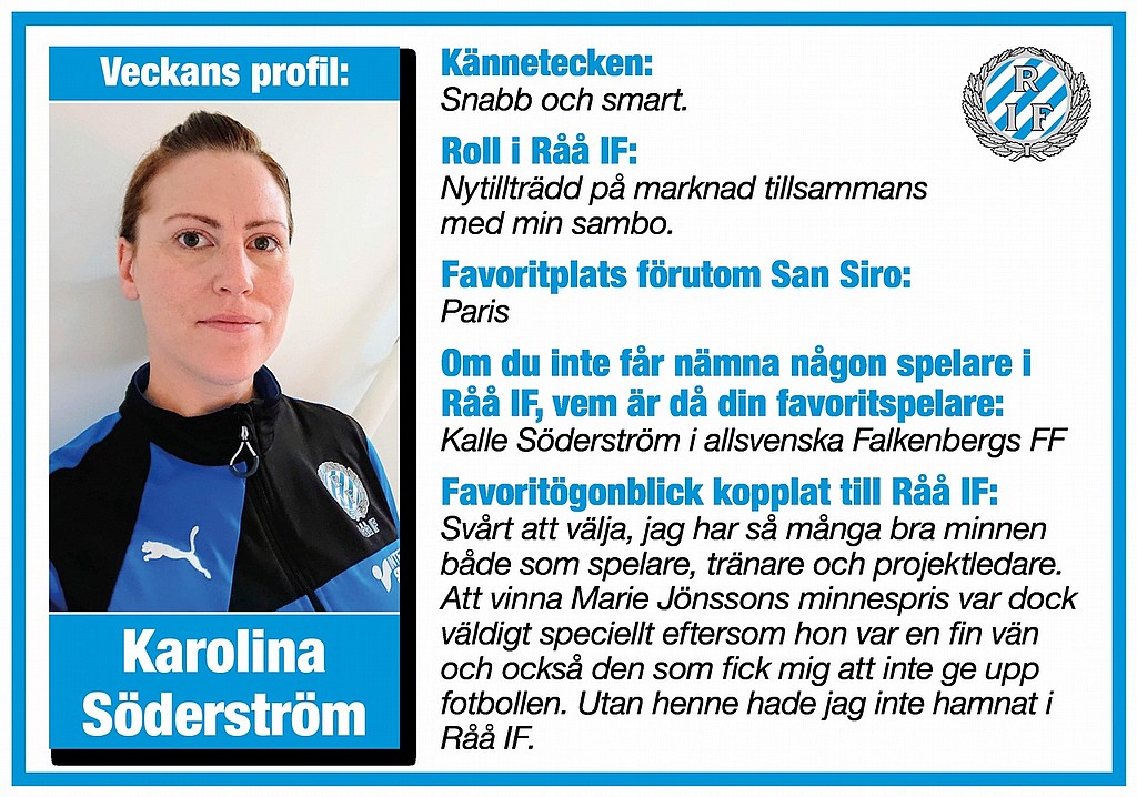 Åhhh så var det fredag igen och vilken helg som väntar oss! Damcup på lördag och Julskyltning på söndag. Idag handlar det dock främst om Veckans profil och denna gång är det vår Karro som ska hyllas. Karolina Söderström har varit med i klubben i många år som spelare, ledare, evenemangsansvarig och styrelseledamot. Vi är nu glada att kunna meddela att hon är tillbaka igen efter sin mammaledighet och denna gång kommer hon att arbeta med marknadsfrågor. Vi önskar Karro och alla er andra en härlig helg och vi hoppas att vi ses i Norrehed och på Rååvägen!