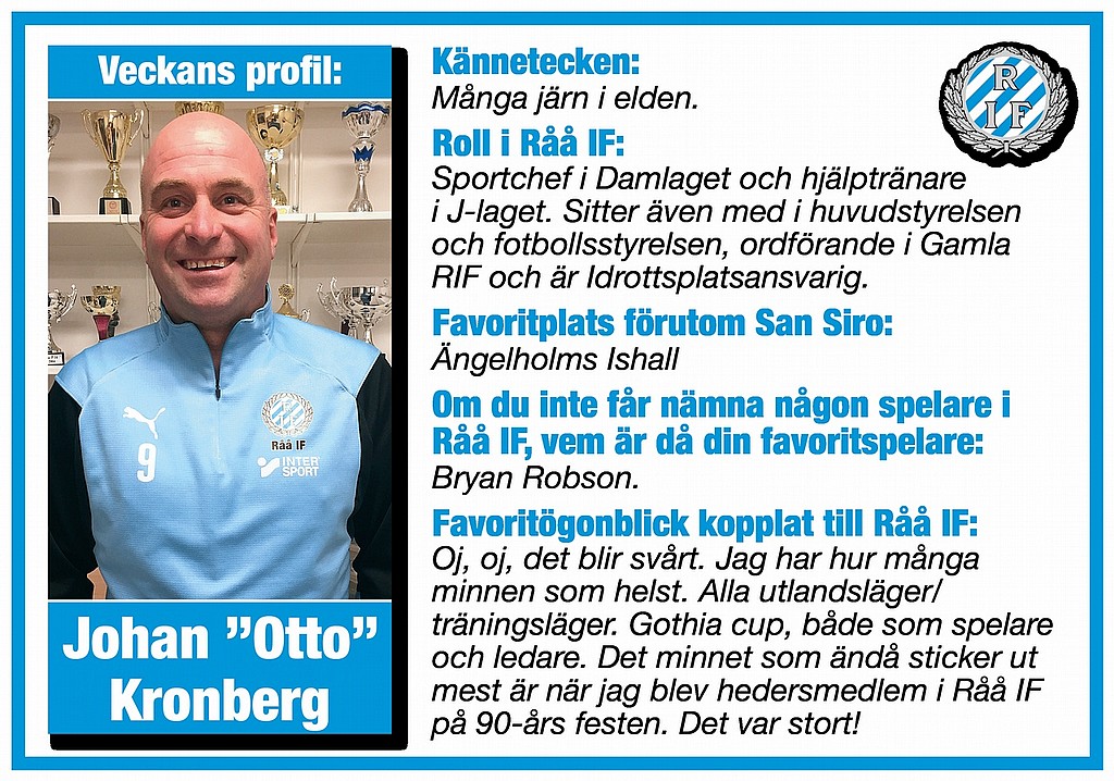 Nu går tiden fort och det är snart andra advent och det är hög tid för oss att hylla en riktig trotjänare i föreningen som Veckans profil. Han är förmodligen den person som sitter på allra flest stolar i föreningen, vi pratar så klart om Johan "Otto" Kronberg. Han är med och hjälper till med damlaget, J-laget, är med i inte mindre än tre styrelser och fixar dessutom till vårt kära San Siro. Vi önskar Otto och alla er andra en fantastiskt fin helg!
