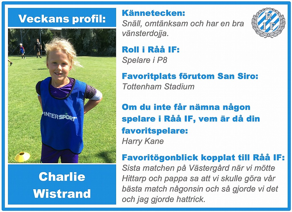 Så var det sista fredagen för 2019 och det firar vi med årets allra sista Veckans profil. Turen har kommit till killen med den vassa vänsterfoten, Charlie Wistrand, som spelar i vårt duktiga P8-lag. Vi önskar Charlie och alla er andra en riktigt fin helg och vi passar också på att önska er alla ett Gott Nytt År!