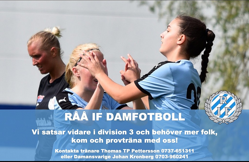 Råå IF har haft damlag i över 45 år och nu behöver vi mer folk. Tycker du att fotboll är fantastiskt roligt och vill vara en del av ett härligt gäng? Är du nyinflyttad, haft uppehåll i karriären eller bara behöver nytändning är du varmt välkommen! Kom och provträna med oss!