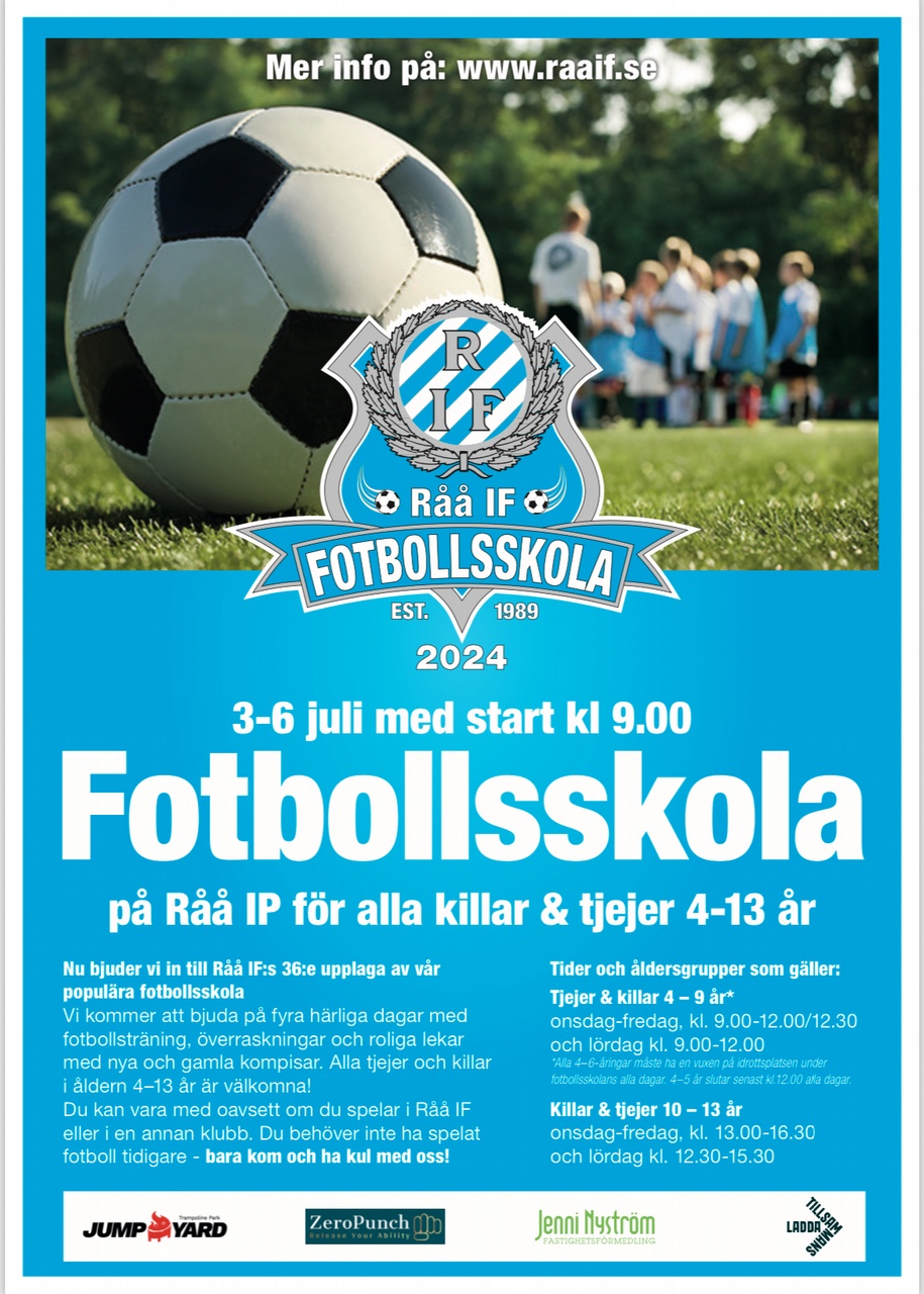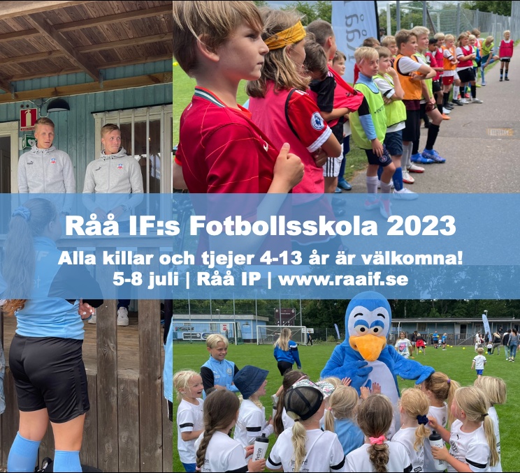 Nu bjuder vi in till Råå IF:s 36:e upplaga av vår populära fotbollsskola. Vi kommer att bjuda på fyra härliga dagar med fotbollsträning, överraskningar och roliga lekar med nya och gamla kompisar. Alla tjejer och killar i åldern 4-13 år är välkomna! Du kan vara med oavsett om du spelar i Råå IF eller i en annan klubb. Du behöver inte ha spelat fotboll tidigare. Kom och ha kul med oss!