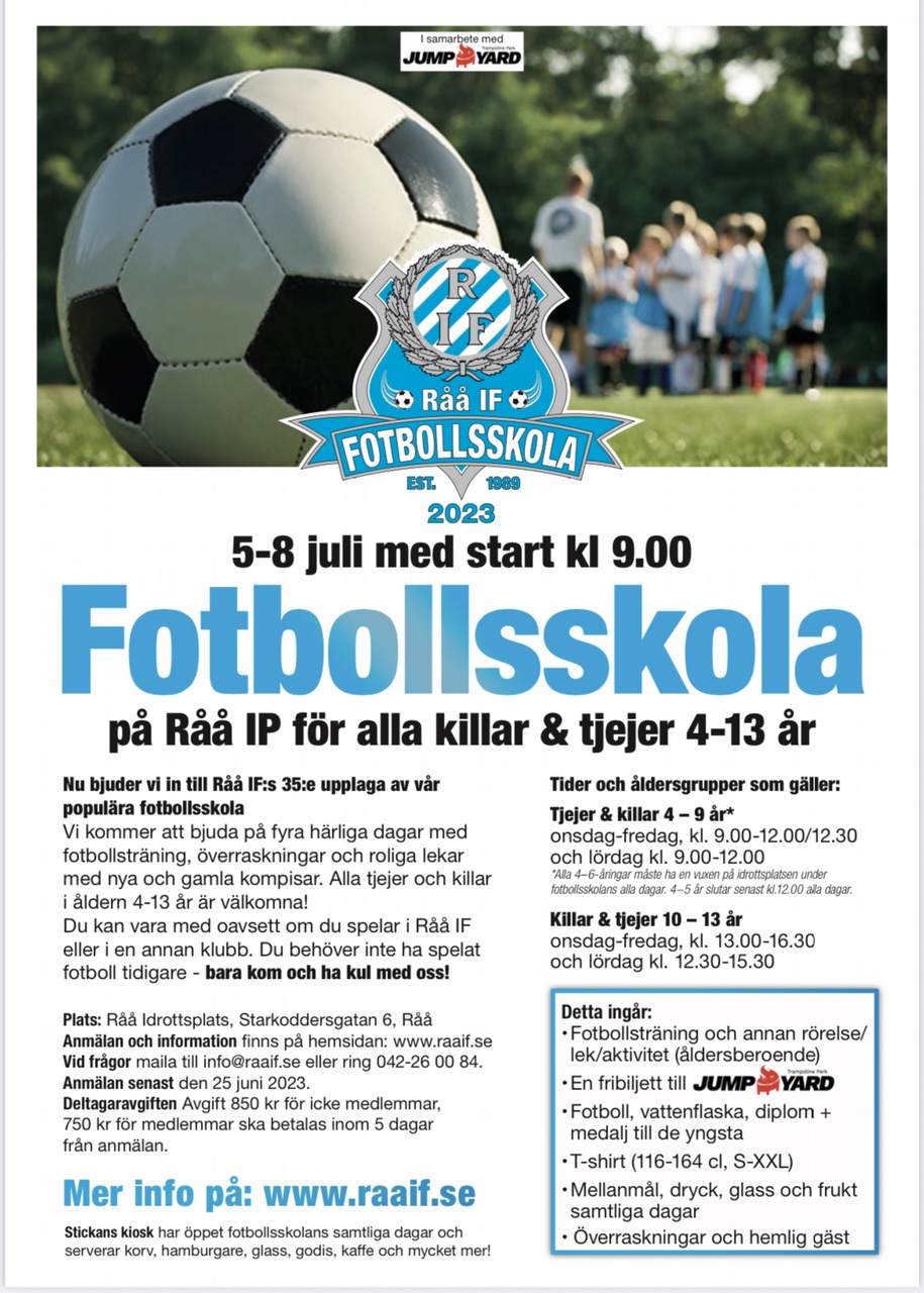 Nu bjuder vi in till Råå IF:s 36:e upplaga av vår populära fotbollsskola. Vi kommer att bjuda på fyra härliga dagar med fotbollsträning, överraskningar och roliga lekar med nya och gamla kompisar. Alla tjejer och killar i åldern 4-13 år är välkomna! Du kan vara med oavsett om du spelar i Råå IF eller i en annan klubb. Du behöver inte ha spelat fotboll tidigare. Kom och ha kul med oss!